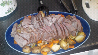 I can't believe I'd never made a pot roast before....we had it a lot when i lived at home with my folks. Mom had a recipe where you added meat, veggies and the cooking liquid to a plastic bag and put it in the microwave. Unconventional, I know, but it was delicious. She always served it with buttered noodles, peas and carrots. Mmmmmmm childhood. :)